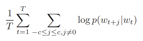 모델 학습은 아래 로그확률 평균 식을 최대화하는 방향으로 진행되며, c는 학습시킬 단어 개수를 의미한다.