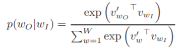 여기에서의 p(w_t+j | w_t)는 아래와 같이 softmax 함수를 이용하여 표현된다.