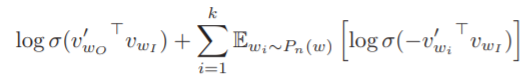 Negative sample을 뽑을 때는 unigram 확률(=단어 등장 빈도 수 / 전체 단어 수)을 이용하여 corpus에 자주 나타나지 않는 단어가 더 많이 뽑힐 수 있도록 하였다. 아래와 같은 목적 함수를 통해 계산되며,